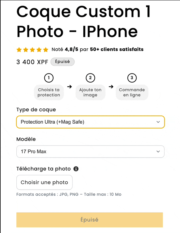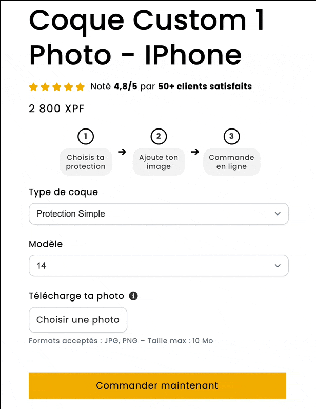 "Super service, j’ai pu personnaliser ma coque en ligne très facilement. La qualité est meilleure que celles achetées sur d'autres sites. Livraison rapide en brousse." – Thomas, Bourail
